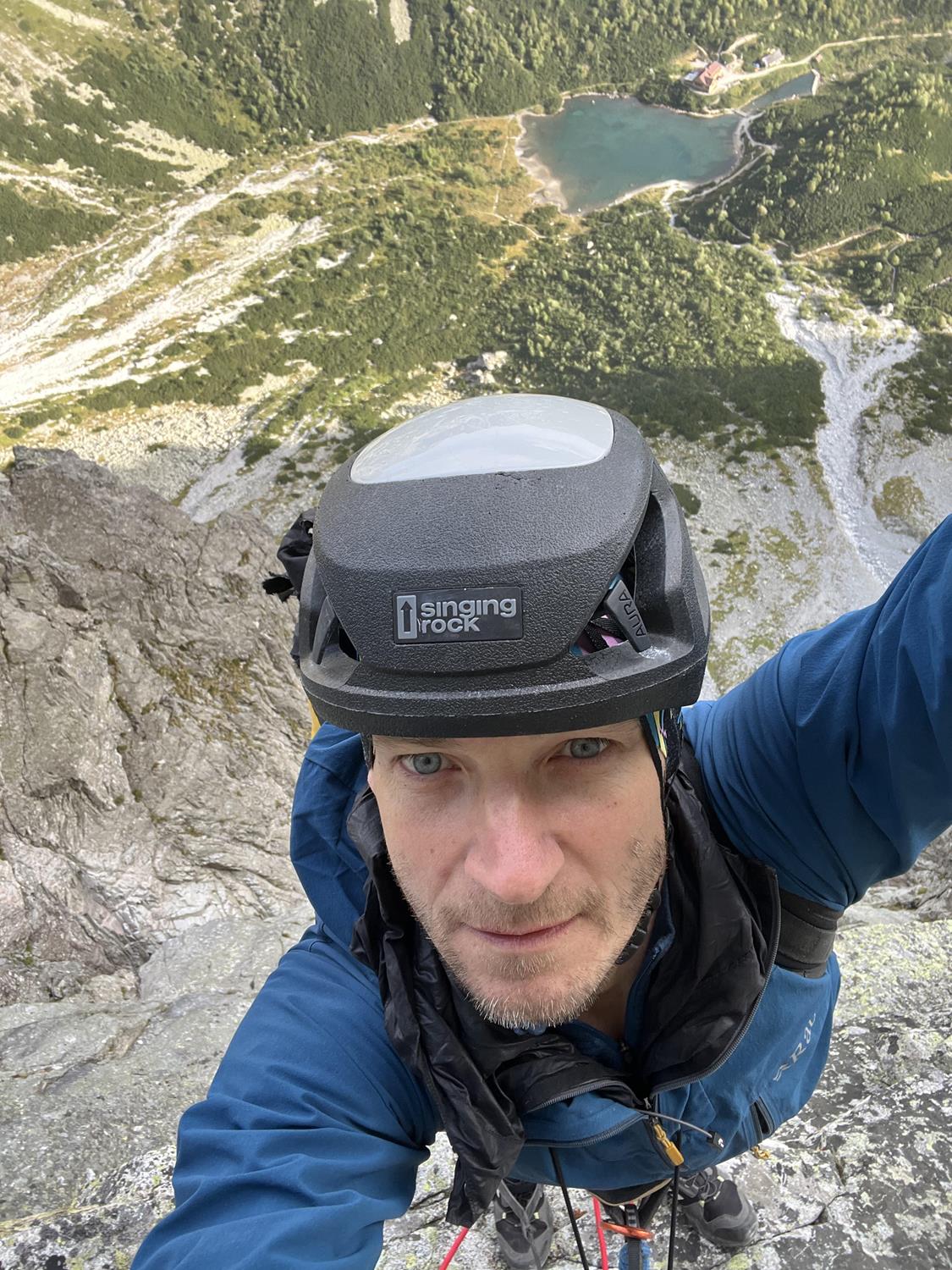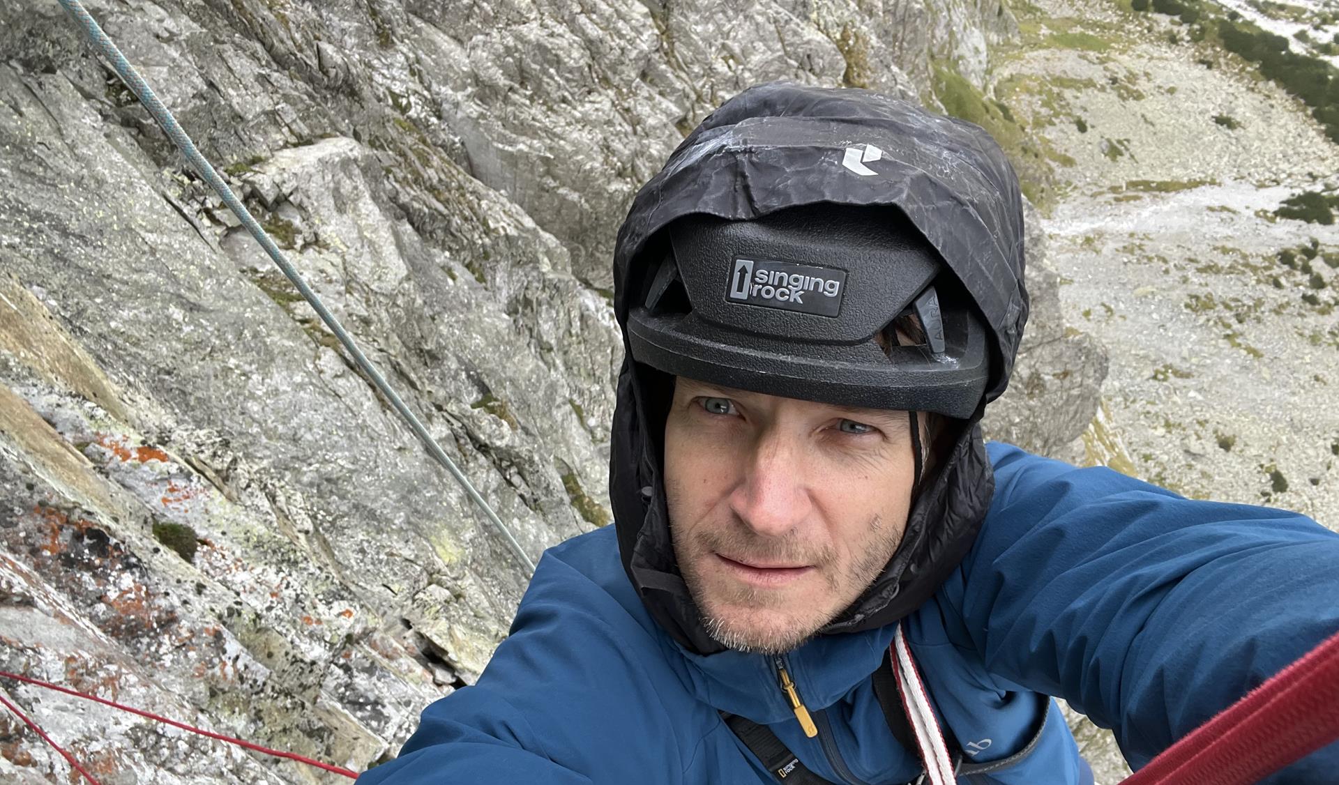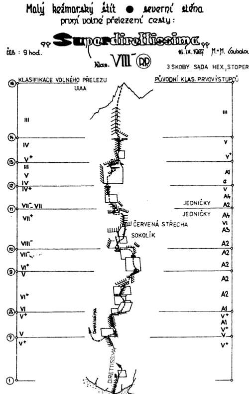 PD: La graduación se debatió en internet. En el topo original de la escalada libre hecho por los hermanos Coubal es 8 UIAA (-?). Luego algo se rompió. Miro Peťo hizo las primeras ascensiones en libre y, “gracias” a los comentarios en internet, sugirió un prudente 9-/9. La primera repetición la hizo Michał Czech, que la graduó como 9. Nosotros hicimos la segunda repetición con Maťo, quien también sugirió 9. Sin embargo, la vía no se trata solo de ese largo, sino que es muy compleja, y un rendimiento de grado 9 (para nosotros escaladores deportivos) no es suficiente…