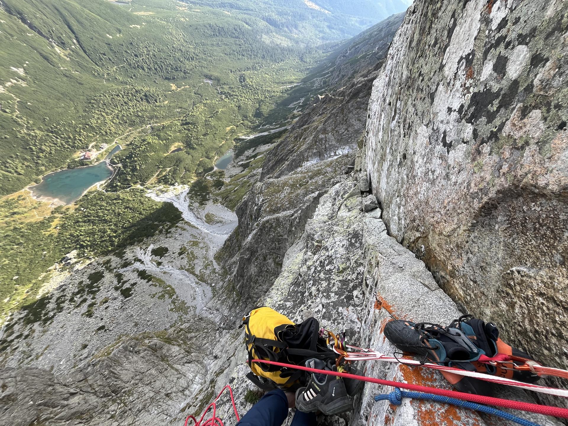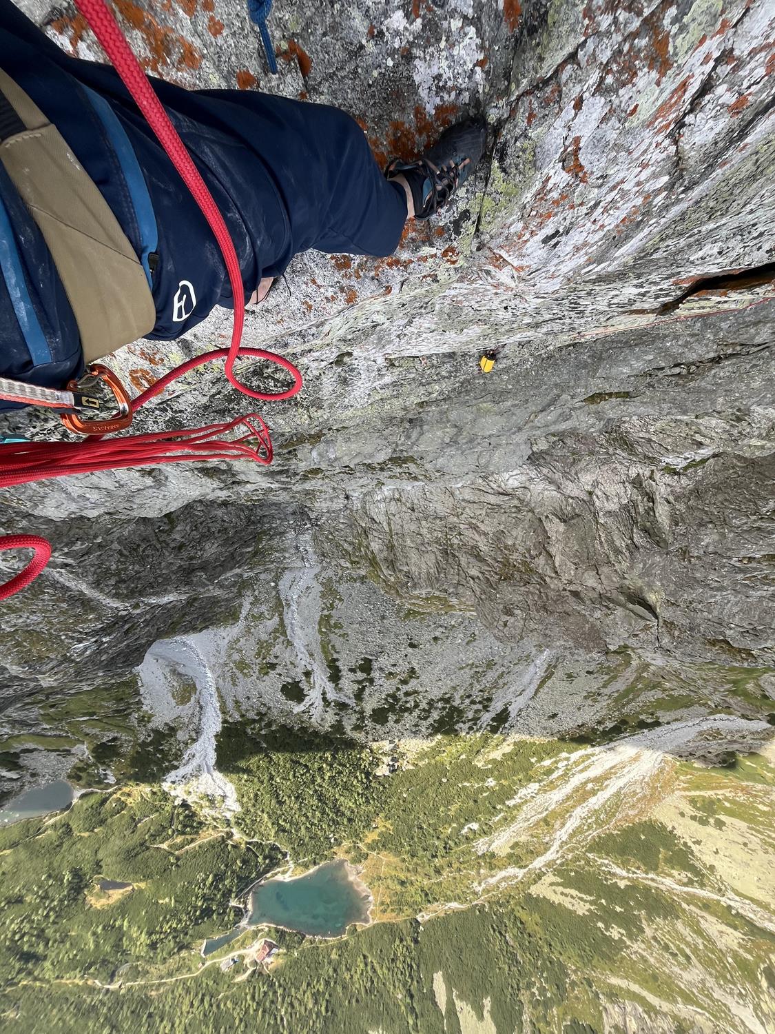 Corte. La mañana del 28 de agosto parto en la Superdiretissima en solitario, bueno, no completamente solo. Llevo un petate pesado conmigo: 4 litros de agua, 2 cuerdas (simple y doble), friends, empotradores, cintas, mosquetones, bloqueadores, ropa de abrigo, saco de dormir, esterilla, equipo de cocina y comida. La vía es larga para los estándares de los Tatras, con 13 largos más la trepada hasta la cima de Pavúková veža. Cuando escalas solo con aseguramiento, también es necesario escalar cada largo, fijar la cuerda en la reunión, quitar algunos seguros al rapelar y dejar otros, y volver a fijar la cuerda con un nudo de alondra para que la funda no se desgaste durante los rápeles posteriores. El reaseguramiento también es necesario en los largos diagonales y en travesías. Después de rapelar hasta la reunión original, se desmonta y vuelves a subir autoasegurado con polea.