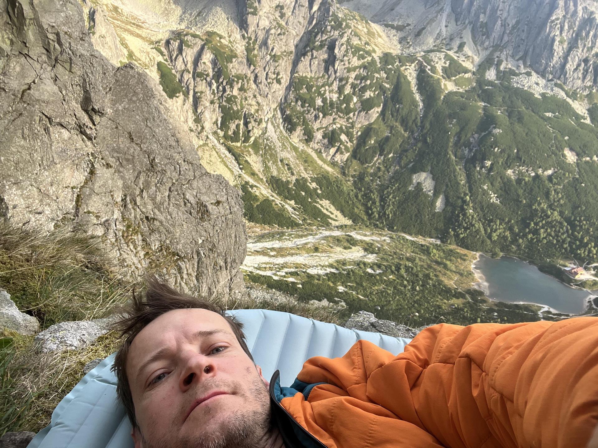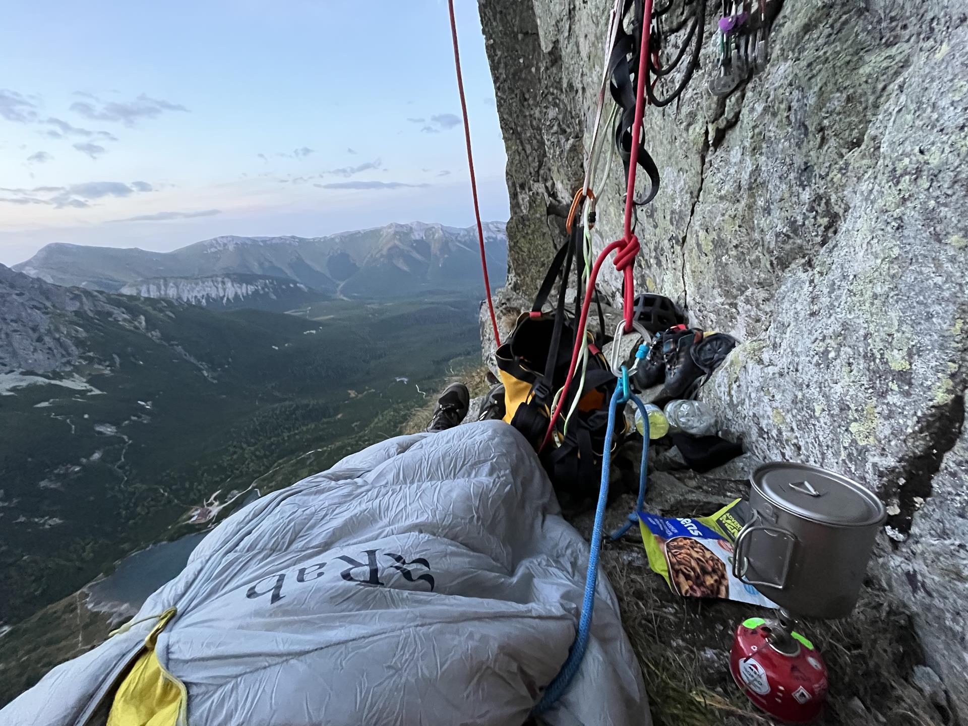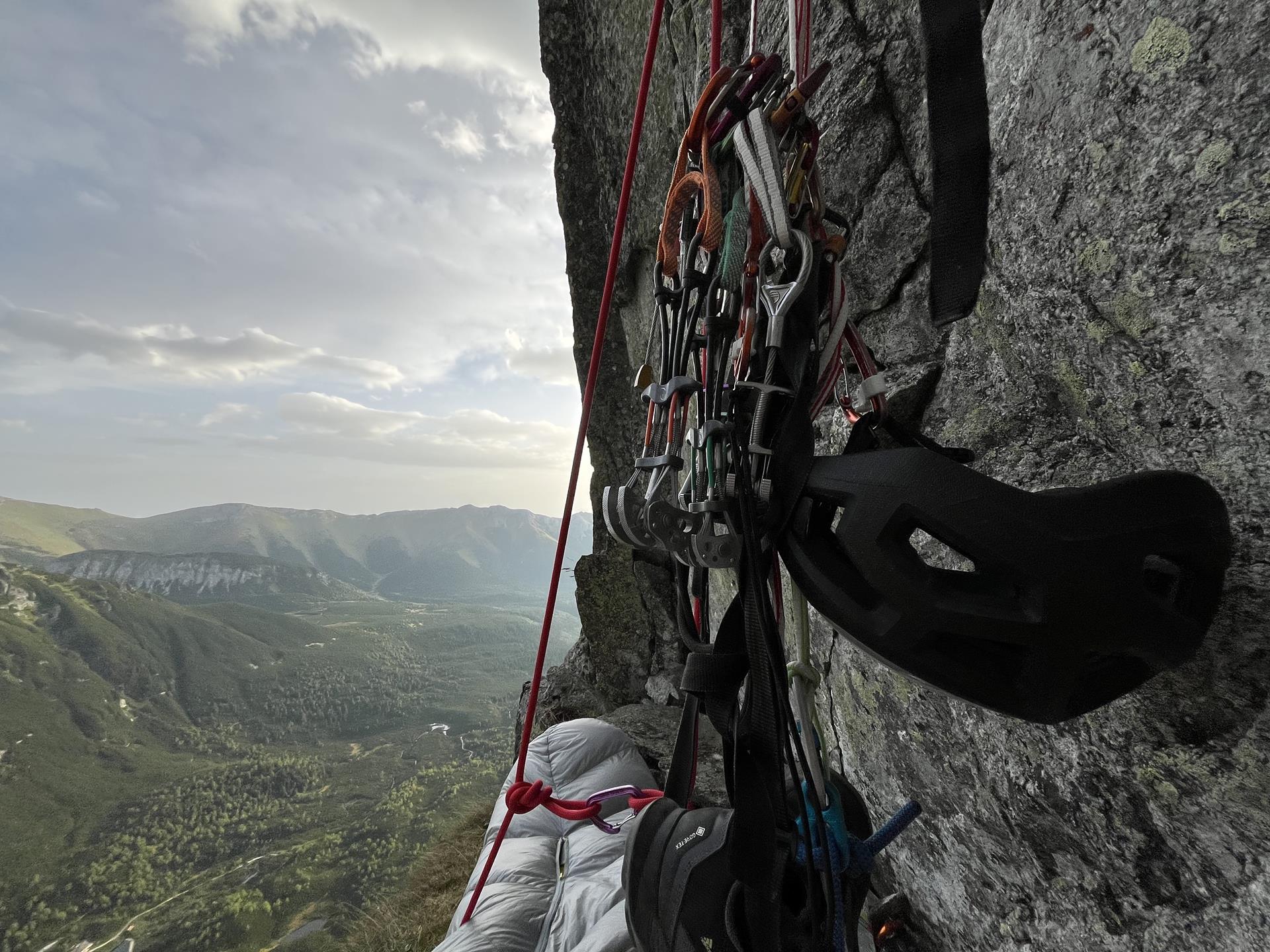 Así que continúo en mi túnel de viento. Pronto llego al séptimo largo, donde hay una repisa inclinada, así que dejo que el petate paste un poco de hierba de los Tatras y sigo escalando. Escalo y aseguro otros dos largos. Luego, romance sobre un colchón inflable por la noche, porque la repisa es buena, pero se inclina en dos direcciones. Además de dormir asegurado con el arnés, también hago un lazo para las piernas.