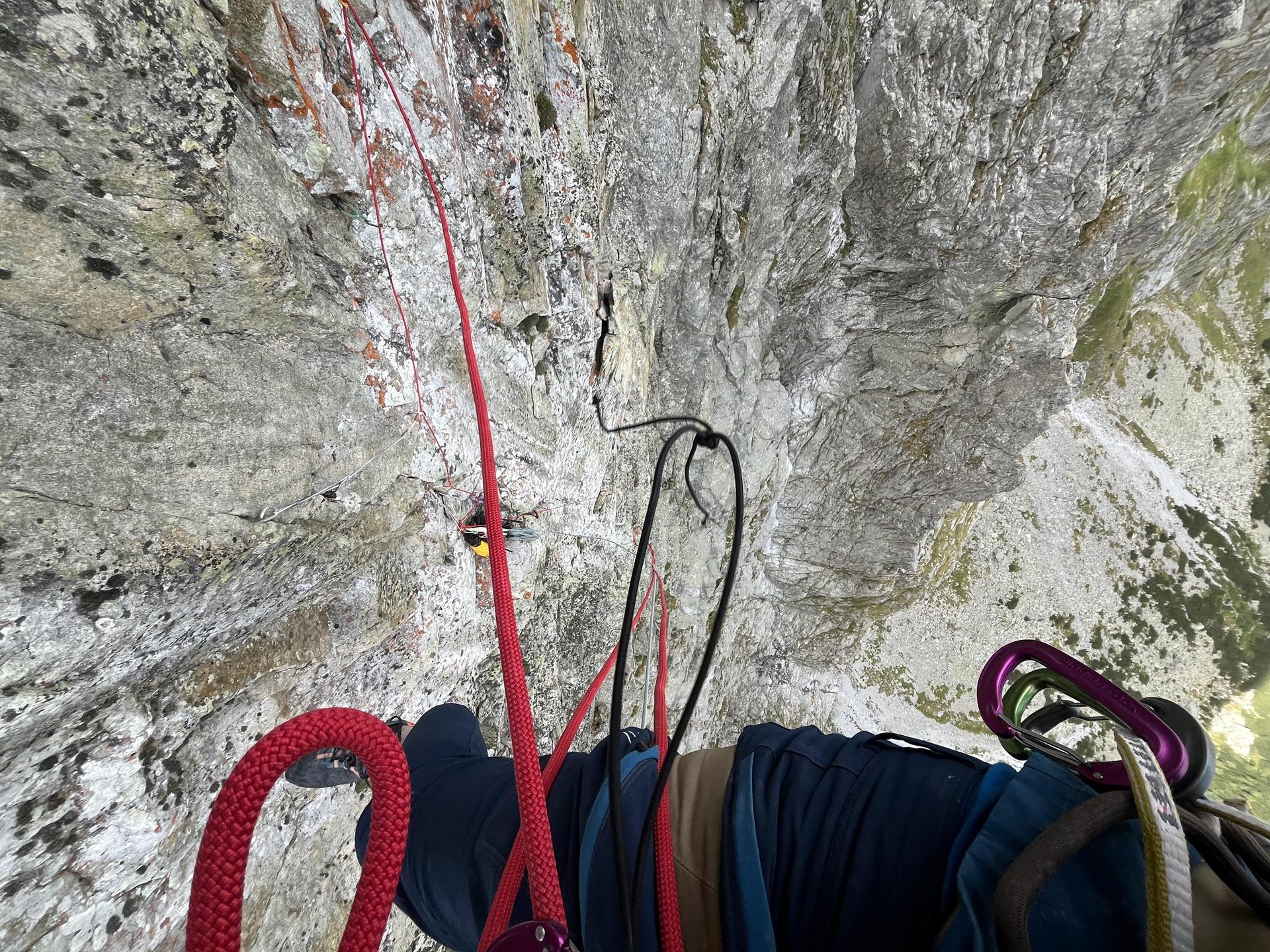 Y luego está el lío de cada anclaje re-fijado, donde necesitas descansar y aflojar la cinta. Así que escalo cada largo (sea arriba o abajo) un total de tres veces. Pero todo esto suponiendo que encadene el largo al primer intento. Si no, el contador de metros empieza a girar de verdad… Y eso me pasó ya en el primer largo. Subestimé la longitud de cuerda que debía llevar. Escalé hasta la reunión y la vi a 3 metros. El terreno era fácil, así que en circunstancias normales (con una cuerda corta) el asegurador empezaría a escalar y esos 3 metros los haríamos simultáneamente. Pero sería complicado explicárselo al petate allá abajo. Así que no me quedó más remedio que destrepar toda la tirada y coger más cuerda.