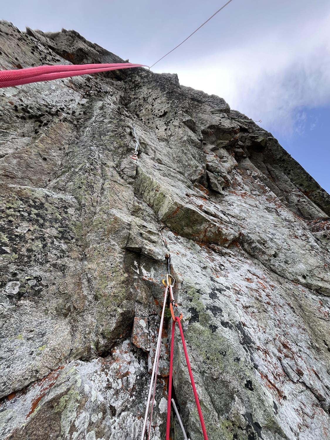 Los siguientes largos fueron bastante bien, mejor de lo esperado. En cambio, las condiciones eran peores de lo esperado. El viento debía soplar a 6-22 m/s, lo cual es bastante fuerte, pero del suroeste. No tenía brújula para comprobar si realmente estaba en la cara norte. Bueno. Seguí adelante de todas formas, más para probar si sería posible escalar en solo y si el vivac estaba bien.