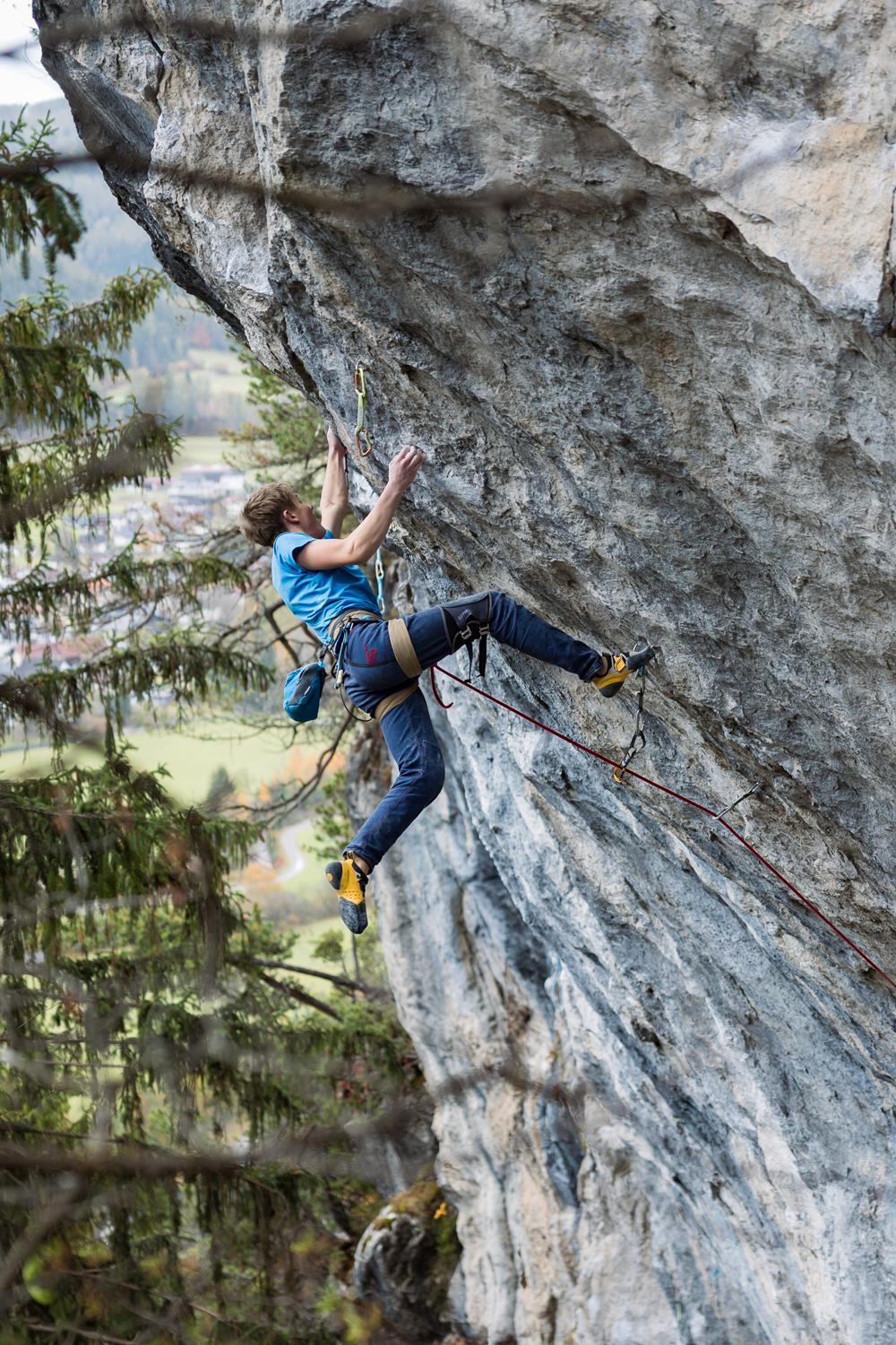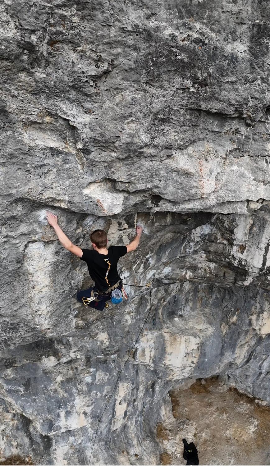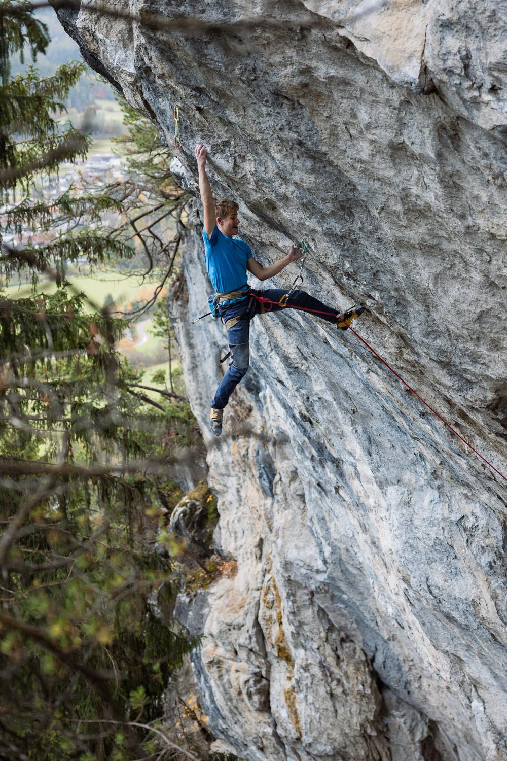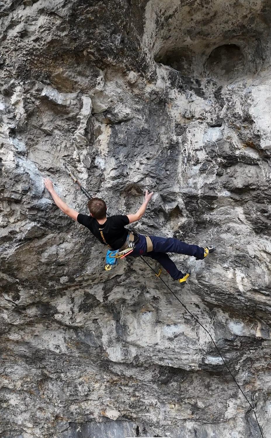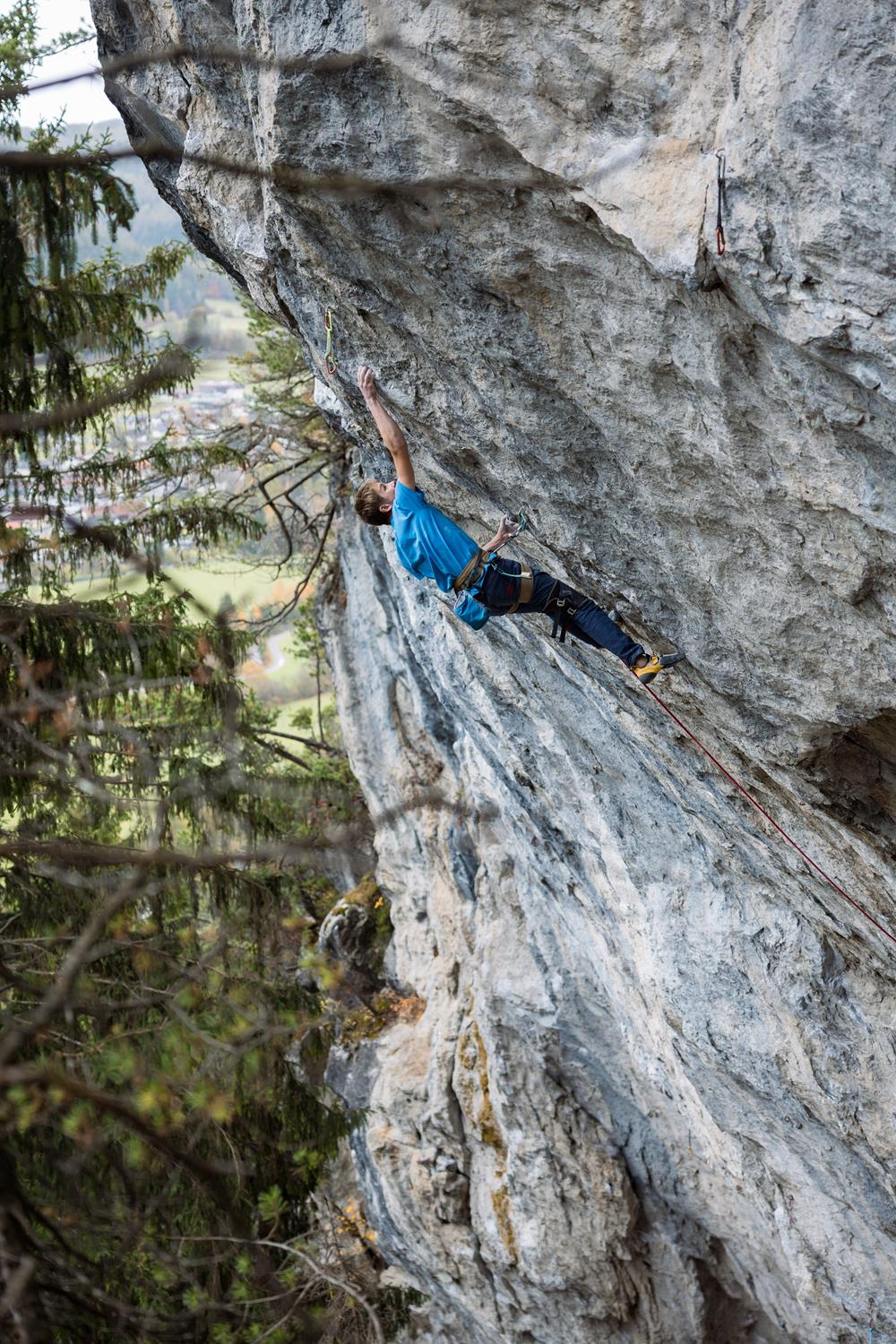 Encadenar la vía Morpheus 8c en Nassereith, Austria. Me exigió mucho, porque pasé dos viajes trabajando en ella. El crux más duro es un movimiento dinámico desde un pequeño invertido, donde tienes que acertar exactamente en la regleta y controlar bien los pies.
